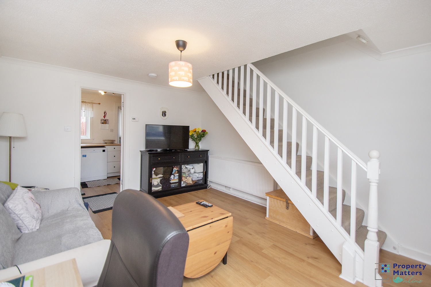 Arranged over two levels, the accommodation is thoughtfully laid out. The entrance porch welcomes you into a bright front facing lounge, featuring a staircase leading to the upper level. A door from the lounge provides access to the kitchen, which is fitted with a range of base and wall mounted units complemented by coordinating worktops. A rear door from the kitchen opens directly onto the garden, offering convenient access to outdoor space.