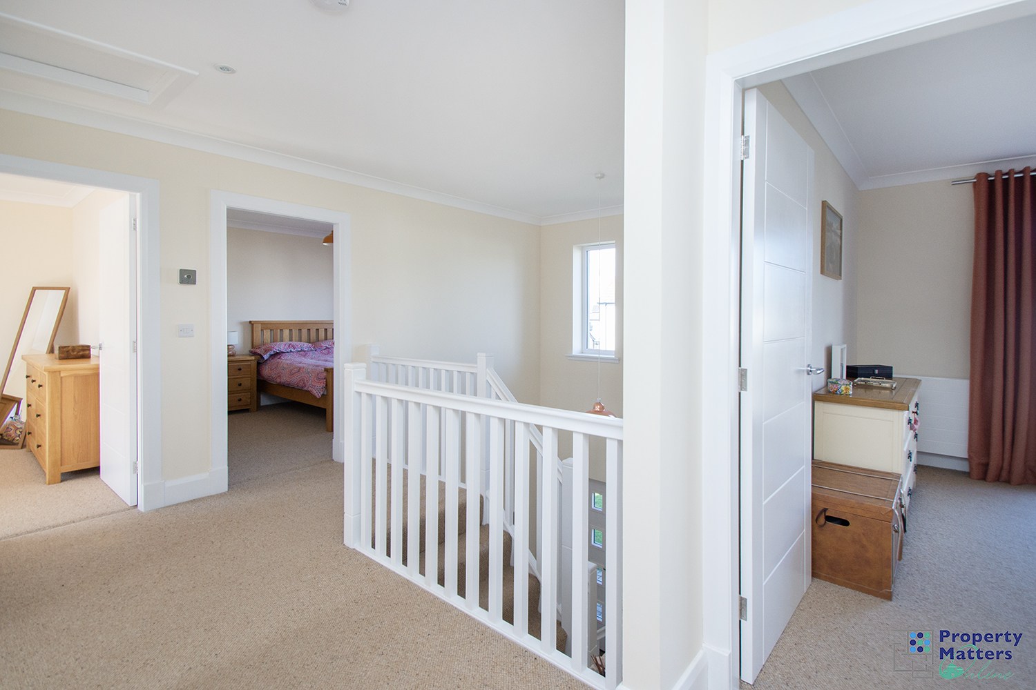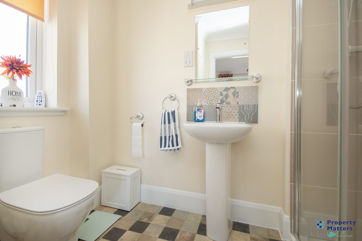 Upstairs, the bright and airy landing overlooks the hallway below andincludes a further storage cupboard. The spacious principal bedroom benefitsfrom a floor-to-ceiling window, built-in wardrobes, and a modern en-suiteshower room with wash hand basin and WC.