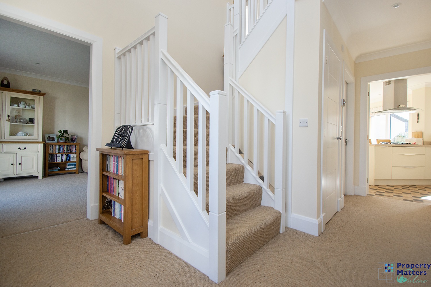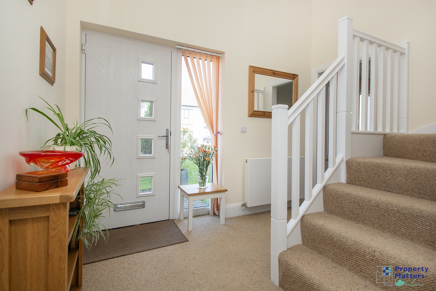 Upon entering, you are welcomed by a spacious hallway featuring a strikingdouble-height ceiling and a statement staircase. The hallway also benefits froma useful storage cupboard and a convenient downstairs WC, complete with washhand basin and toilet.