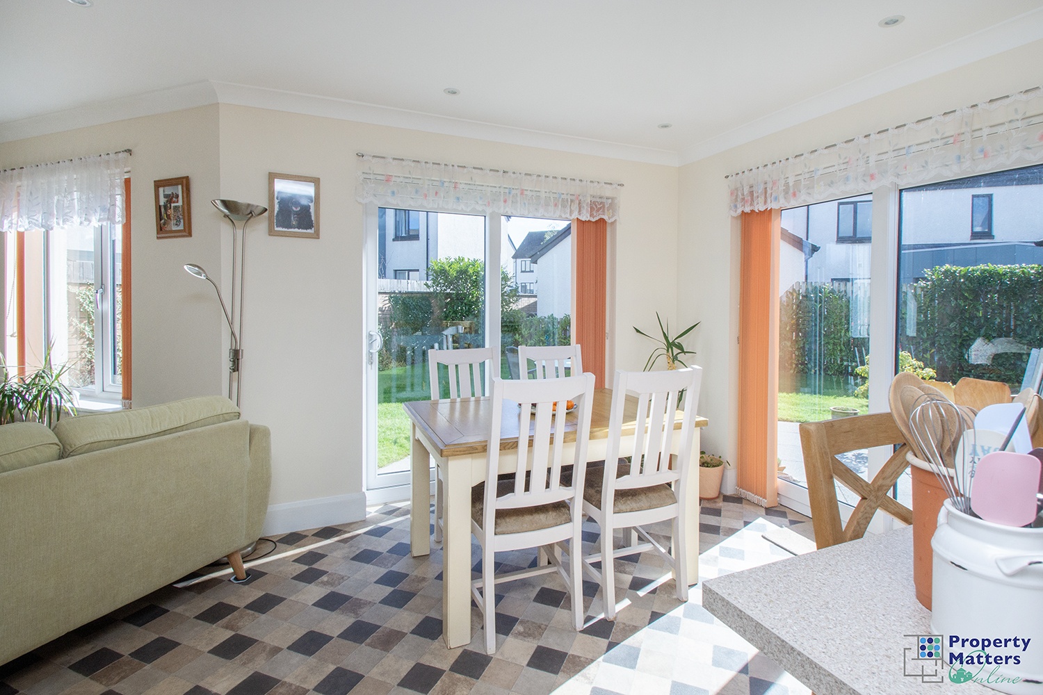 To the rear, the open-plan kitchen, dining, and family area truly forms theheart of the home. The contemporary kitchen is fitted with a range of wall andbase units, along with integrated appliances including an oven, gas hob,extractor hood, dishwasher, and fridge freezer. A breakfast bar adds furtherpracticality. The dining area features twin double sliding doorsopening onto the south-facing rear garden, while the family area provides anadditional relaxed living space.