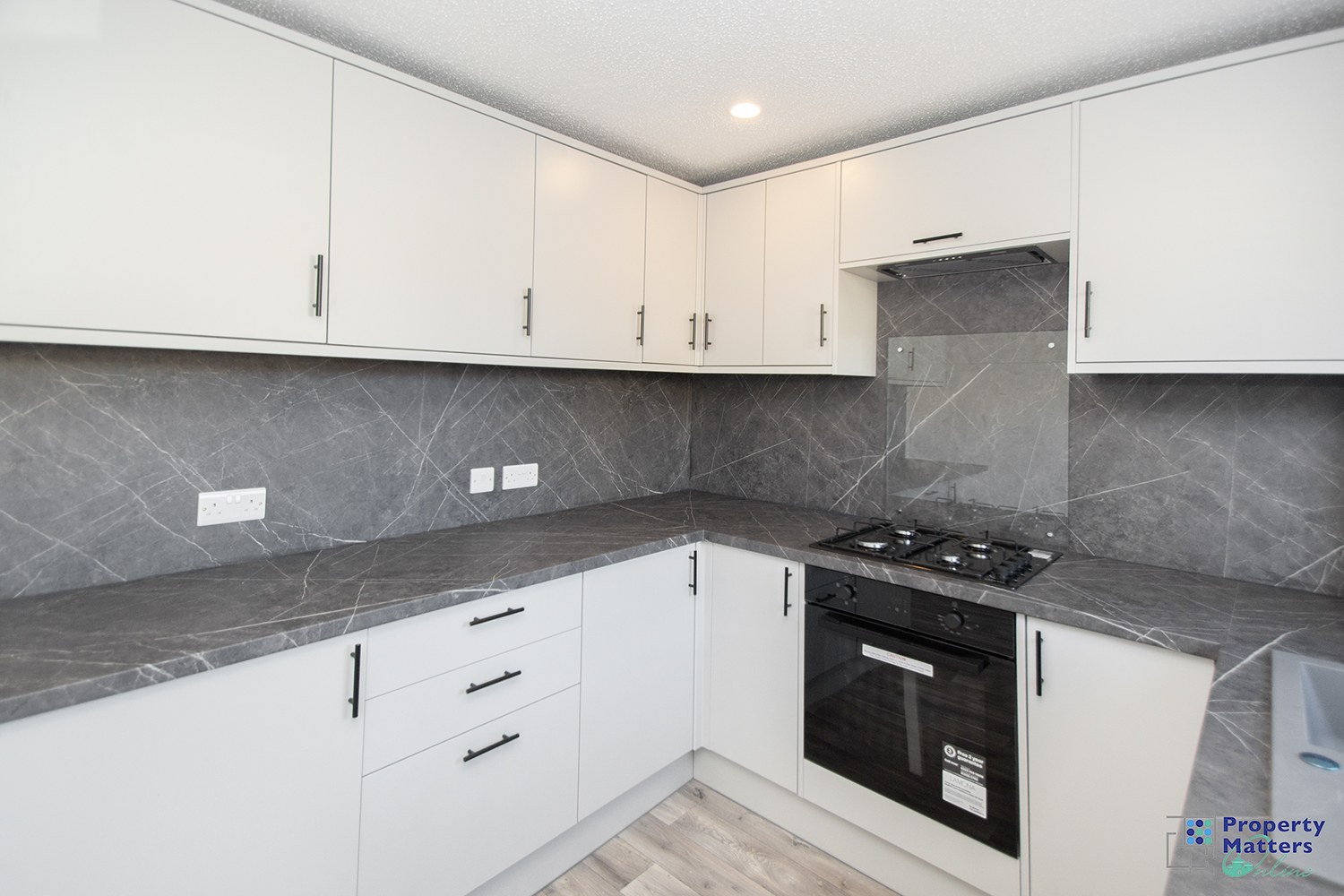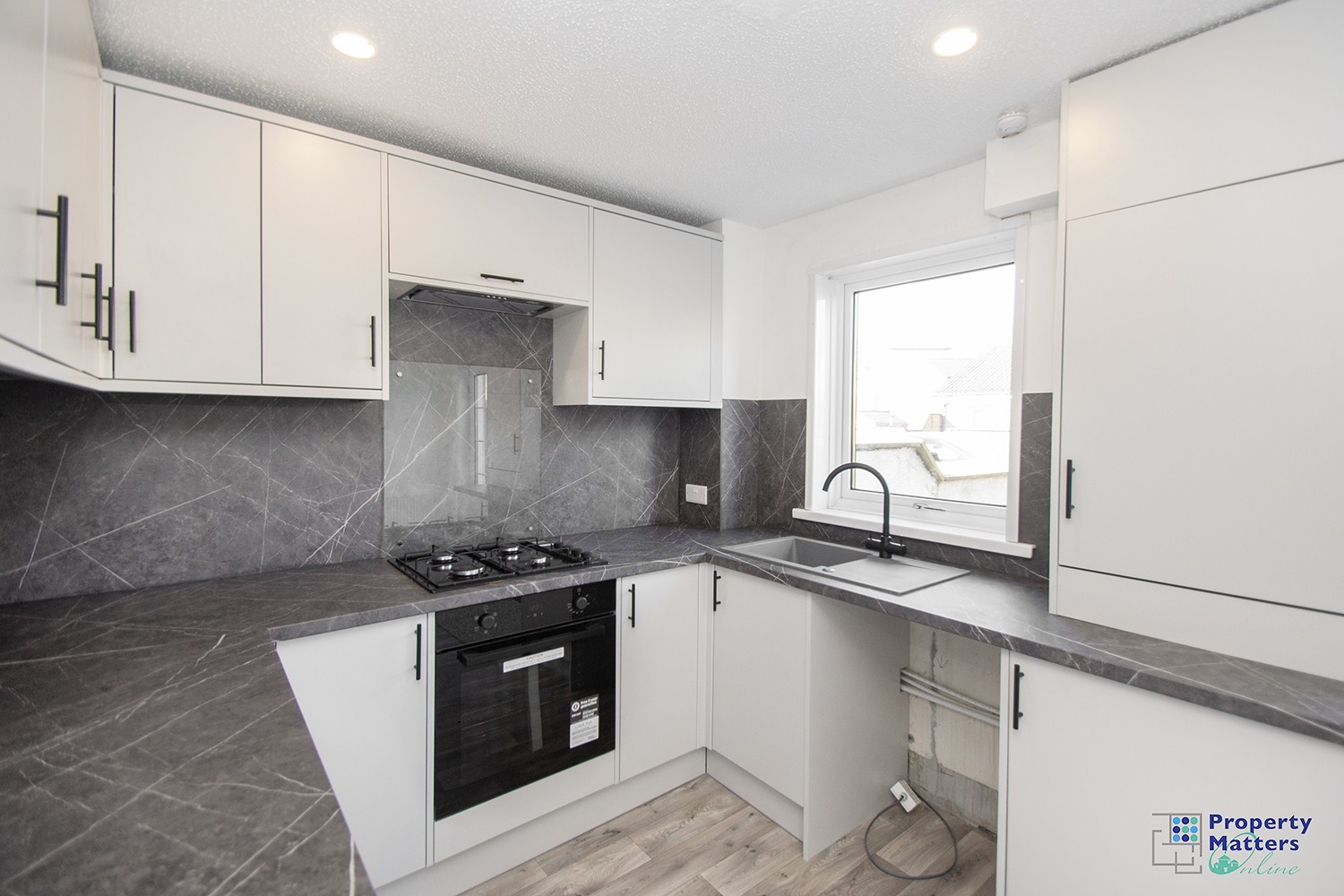 The refitted kitchen diner is well-equipped with wall-mounted upper and lower cabinets, an integrated oven, hob, extractor along with space for a freestanding washing machine, making it both practical and functional for everyday living. French doors give access to the rear garden.