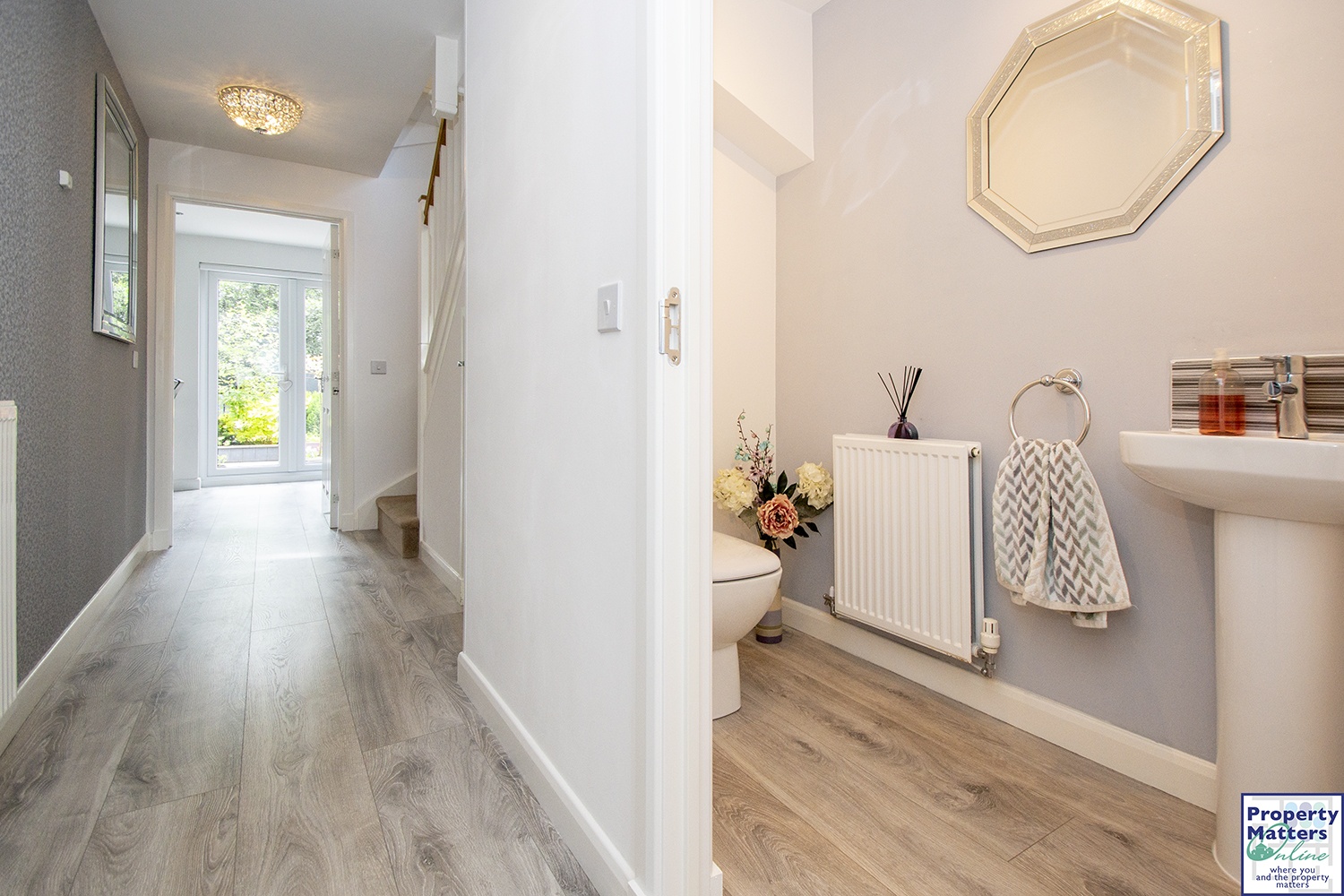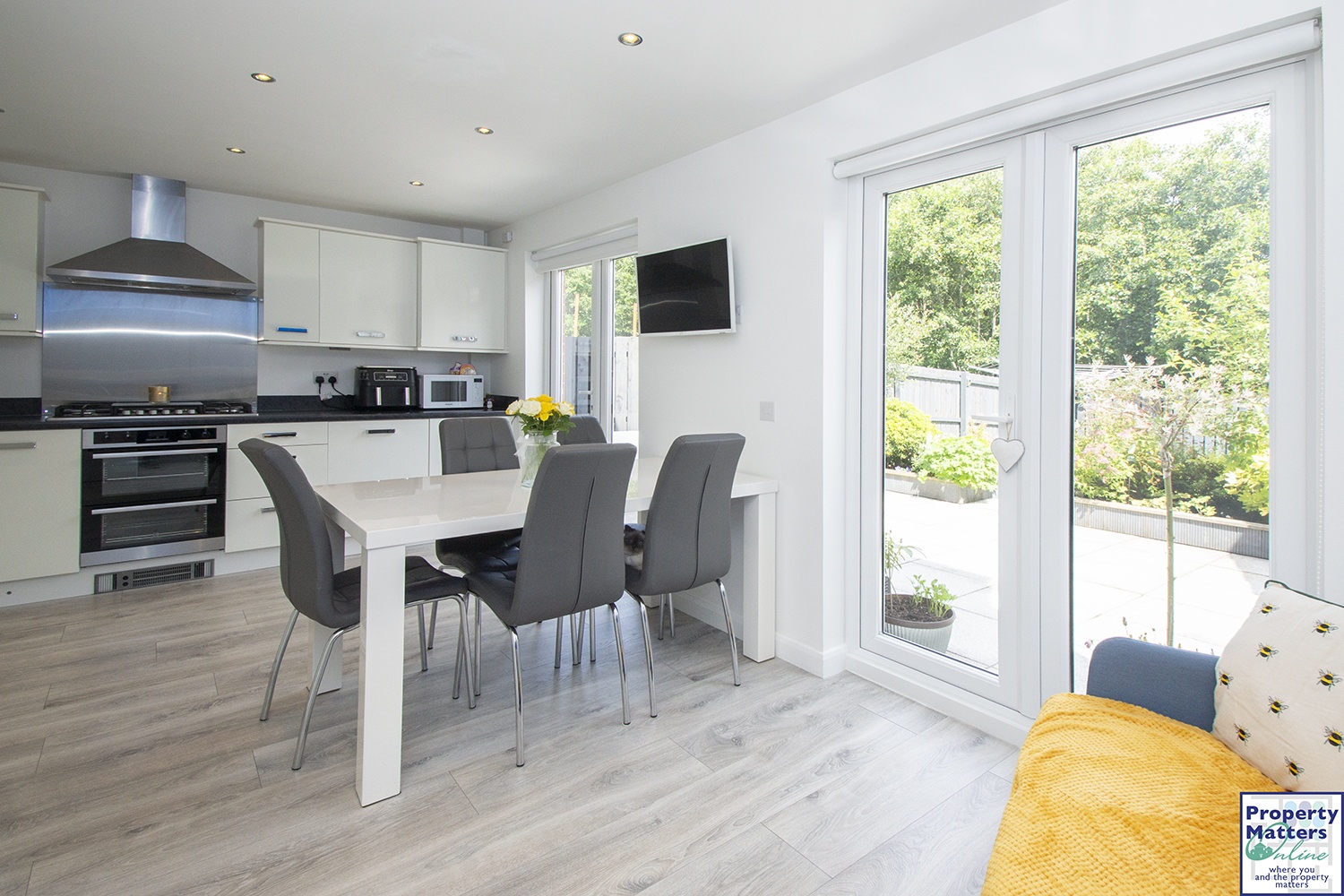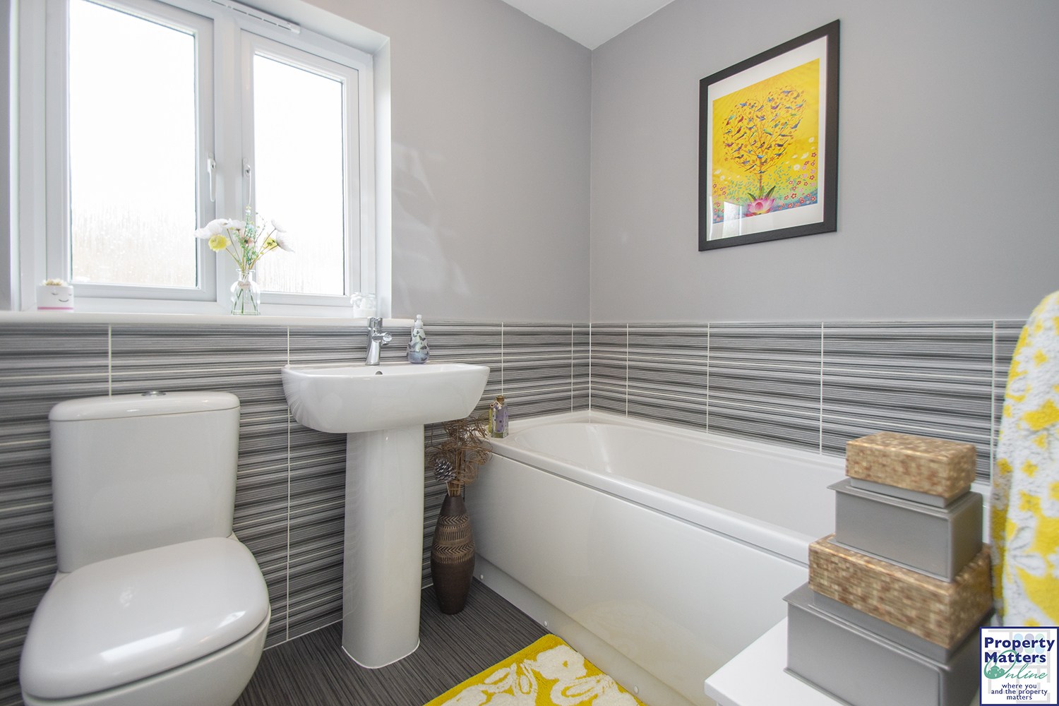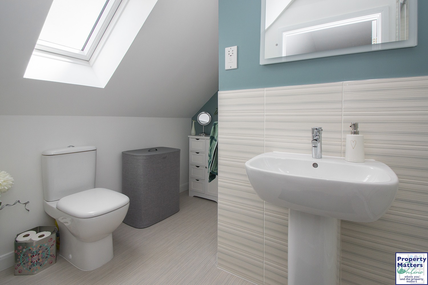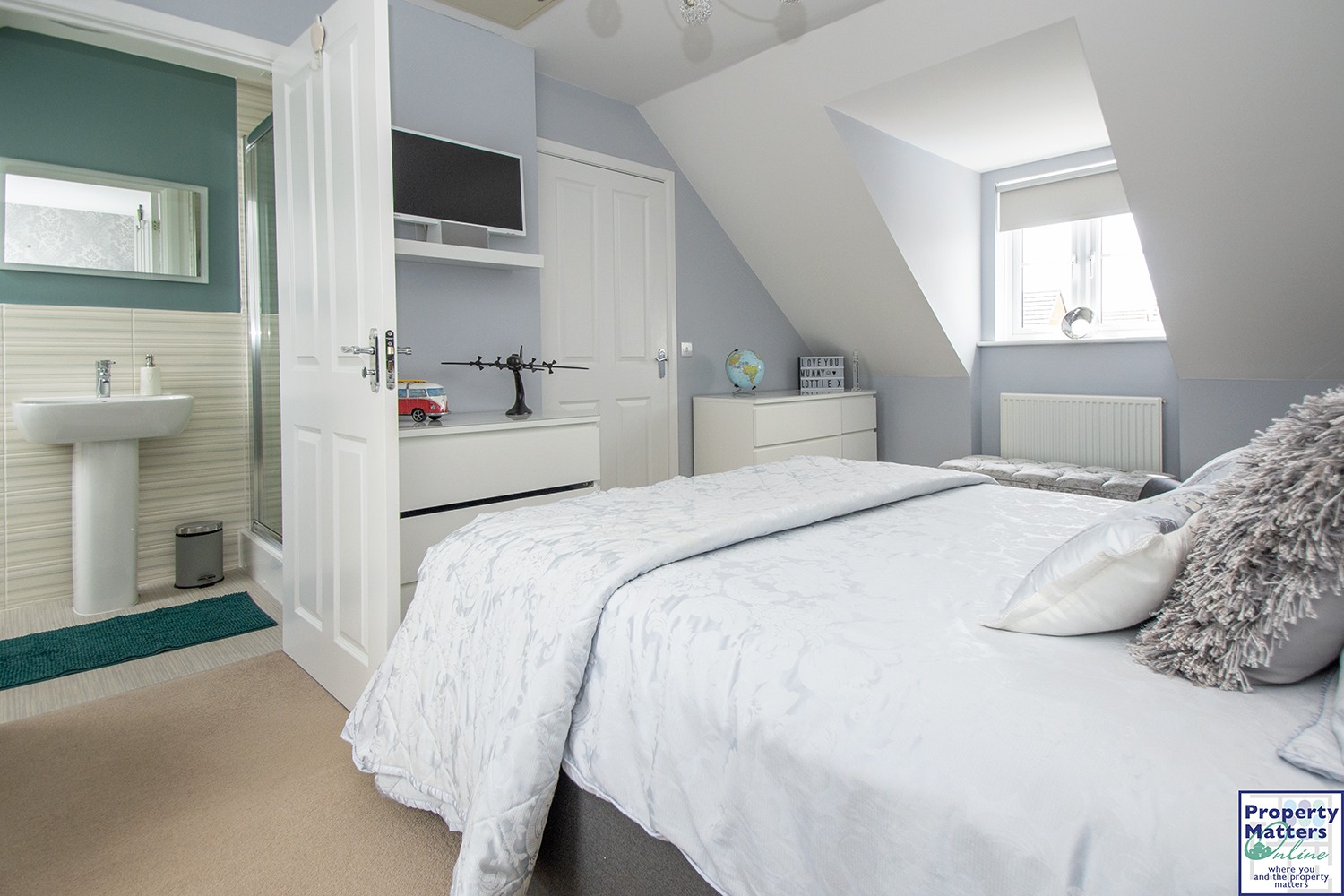Theaccommodation: entrance hallway, large spacious front facing lounge withfeature bay window, modern kitchen/diner with integrated appliances with twinFrench doors giving access to the garden, handy downstairs cloakroom, staircaseleading to first floor.  On the firstfloor there are 3 bedrooms.  Bedroom twohas its own ensuite and fitted wardrobes. There is also a modern family bathroom. On the second level the main bedroom has great storage and its ownensuite.  Gas CH. DG. Contemporary décorwith quality fitments throughout. Large driveway offering parking for severalcars leading to detached garage with power and light.  Well maintained garden to front and fullyenclosed very private rear garden with patio grassed and planted areas.  Early viewing advised of this lovely familyhome.