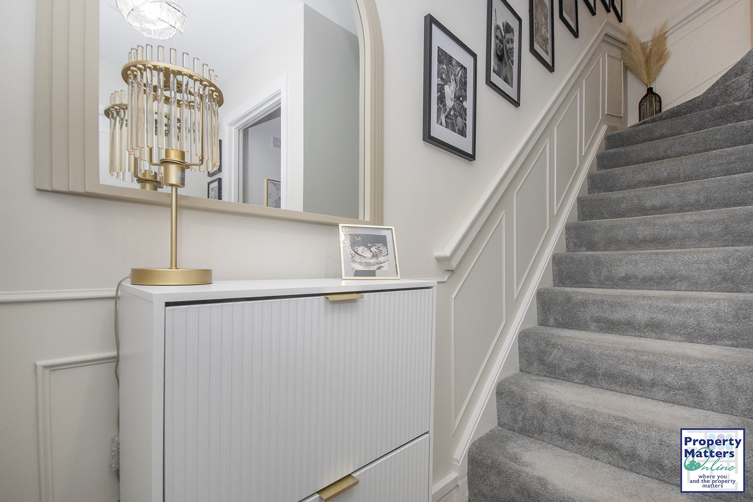 Step into a welcoming hallway, complete with a modern downstairs WC, compromising of a wash hand basin, WC, and tastefully half-tiled walls. The hallway also provides access to the staircase leading to the first floor.