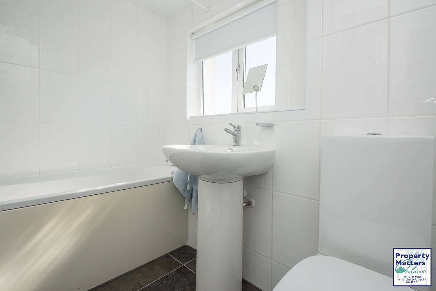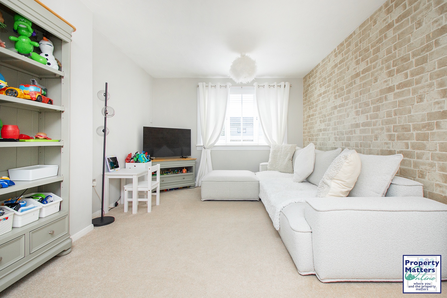Upstairs, you’ll find a generously sized principal bedroom with twin front-facing windows, along with two further well-proportioned bedrooms, and a modern three-piece family bathroom complete with WC, wash hand basin, and bath with overhead shower.