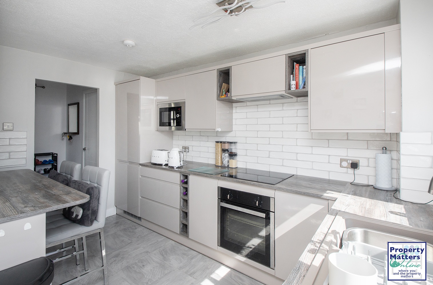 The ground floor features a welcoming vestibule and entrance hallway, a spacious lounge/dining area with dual-aspect windows that flood the space with natural light, and a contemporary kitchen fitted with an excellent range of base and wall units, complementary worktops, tiled splashbacks, a breakfast bar, and quality integrated appliances — ideal for everyday living and entertaining.