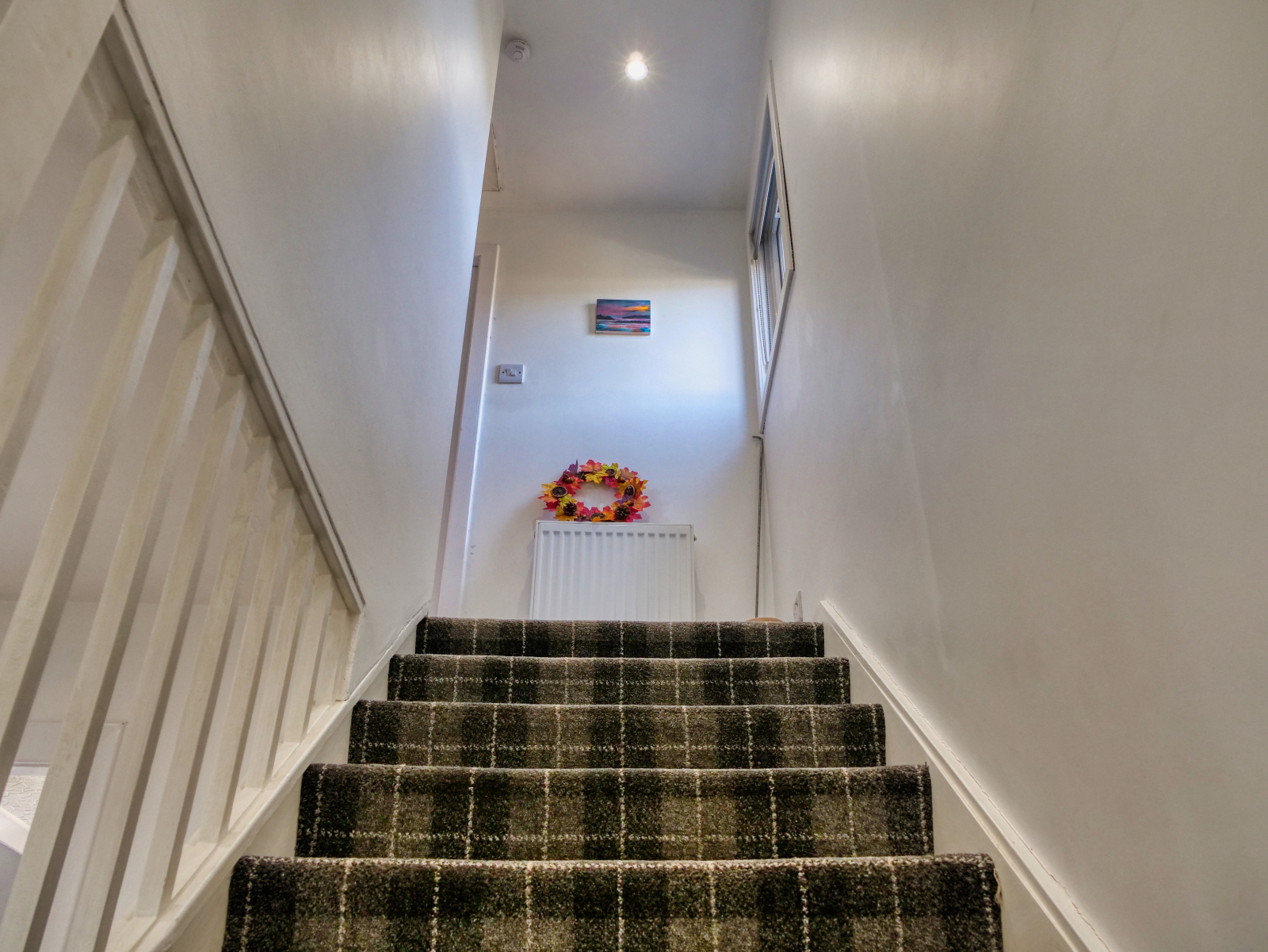 On the upper level, there are two double bedrooms, both with built-in storage, and a contemporary shower room, which includes a shower cubicle with thermostatic shower and a vanity unit housing the WC and wash hand basin.