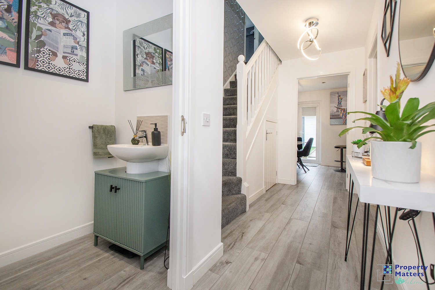 From the moment you step into the welcoming entrance hallway, complete withunder-stairs storage and sleek grey oak flooring, the home impresses with itsthoughtful layout and attention to detail. The front-facing lounge is astatement of modern design, featuring a full-length media wall with panellingand an inset electric fire with realistic flame effect, creating a warm andinviting focal point.