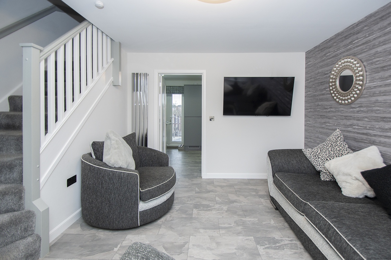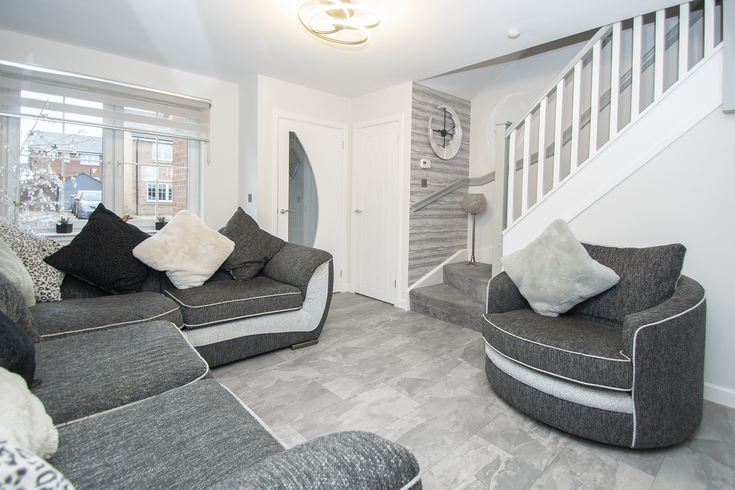 Well-proportioned lounge with front facingwindow. The lounge benefits from quality flooring and handy storage cupboard.Staircase leading to upper-level accommodation. Modern decor. Ample powerpoints. Please note light fitting not included in sale.