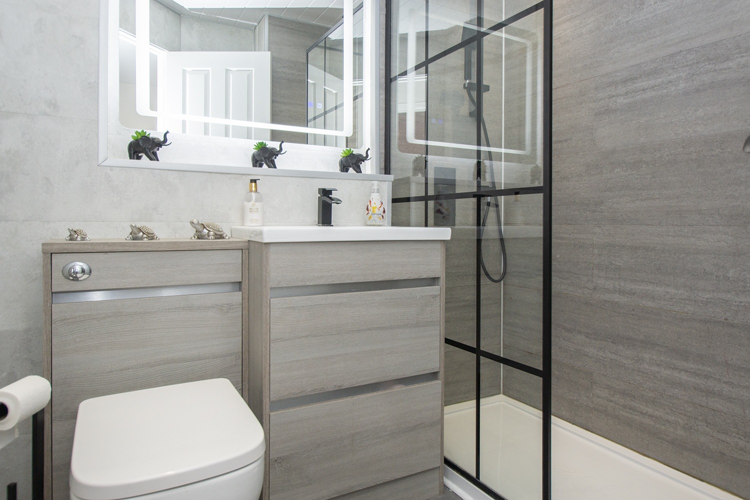 3 piece family shower room comprising WC, washhand basin with pedestal and large shower enclosure.  Contemporary styling with modern vanity units,wet wall splashback and thermostatic shower.