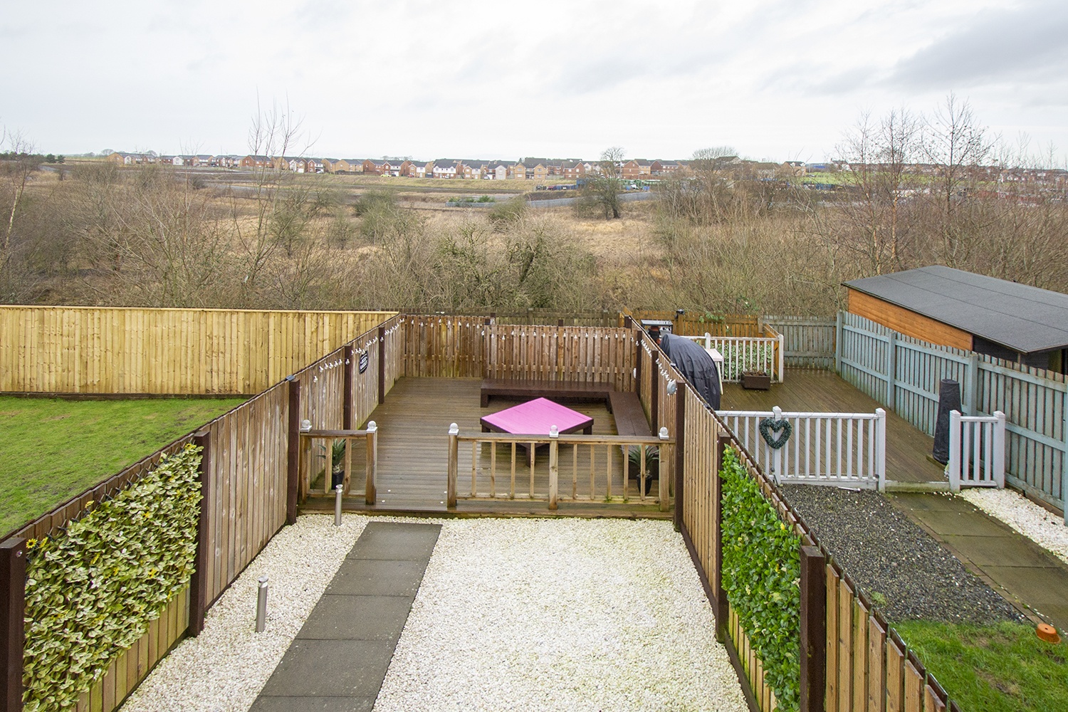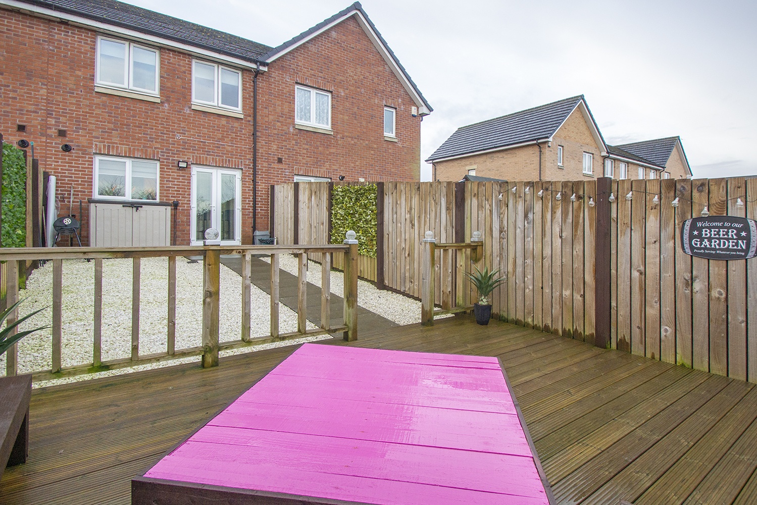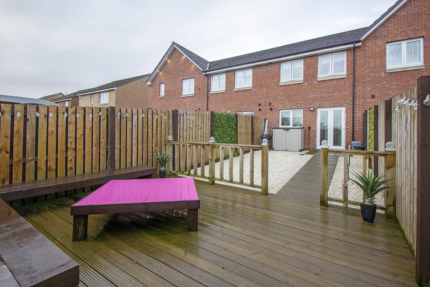 Off-street parking is provided to the front ofthe property with driveway and chipped garden area. The rear garden is fullyenclosed with large decking area and mainly chipped area designed for ease ofmaintenance. Feature lighting. This is an ideal spot for relaxation andentertainment.