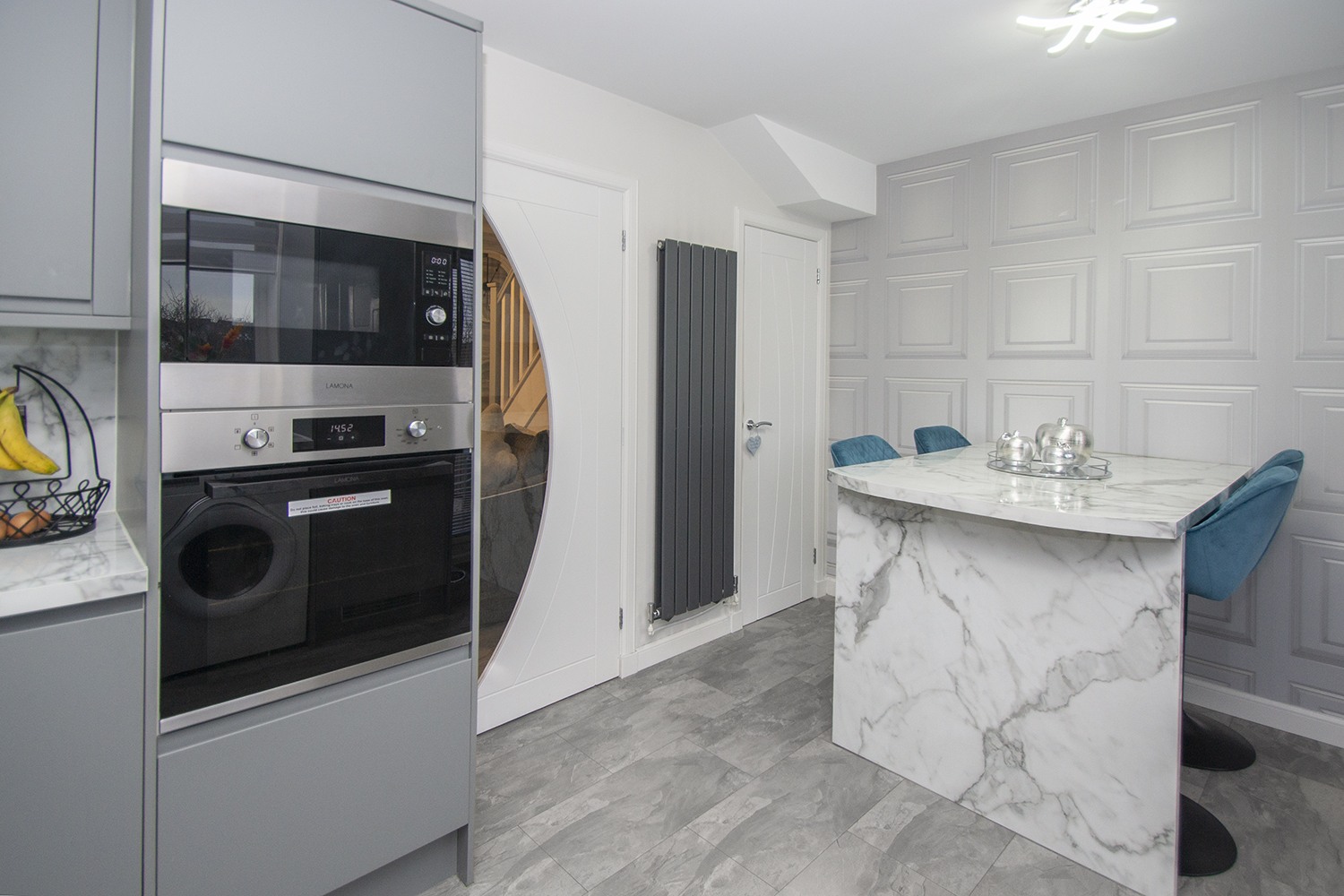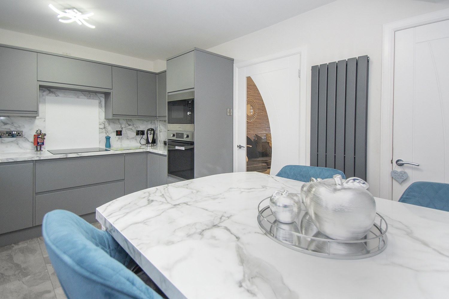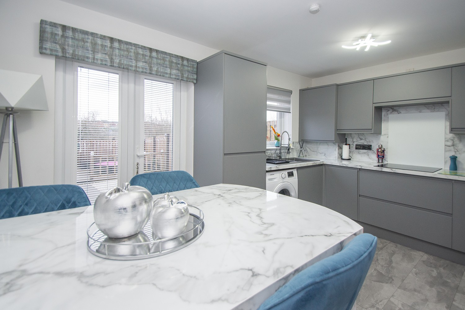Contemporary dining kitchen housing and amplerange of base and wall units with complementary worktops and up turns. Thekitchen benefits from integrated electric oven, microwave, electric hob and extractorhood, washing machine, inset sink with mixer tap, integrated dishwasher andfridge freezer, quality flooring and lighting. Rear facing window and Frenchdoors to rear garden. Ample power points.