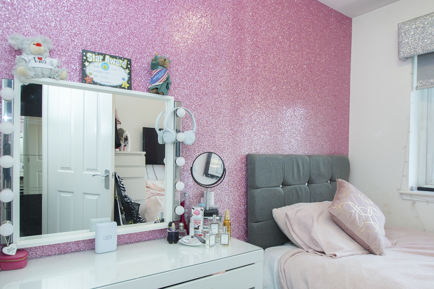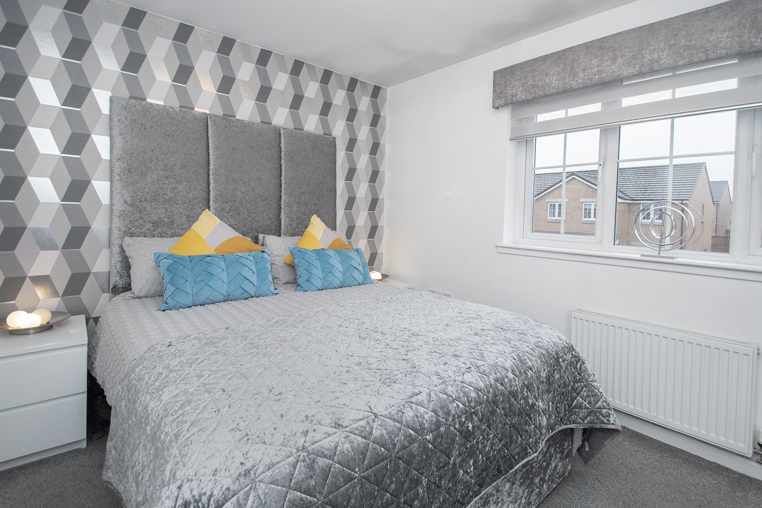 Rear facing bedroom whichbenefits from carpeted flooring, modern decor and ample power points.