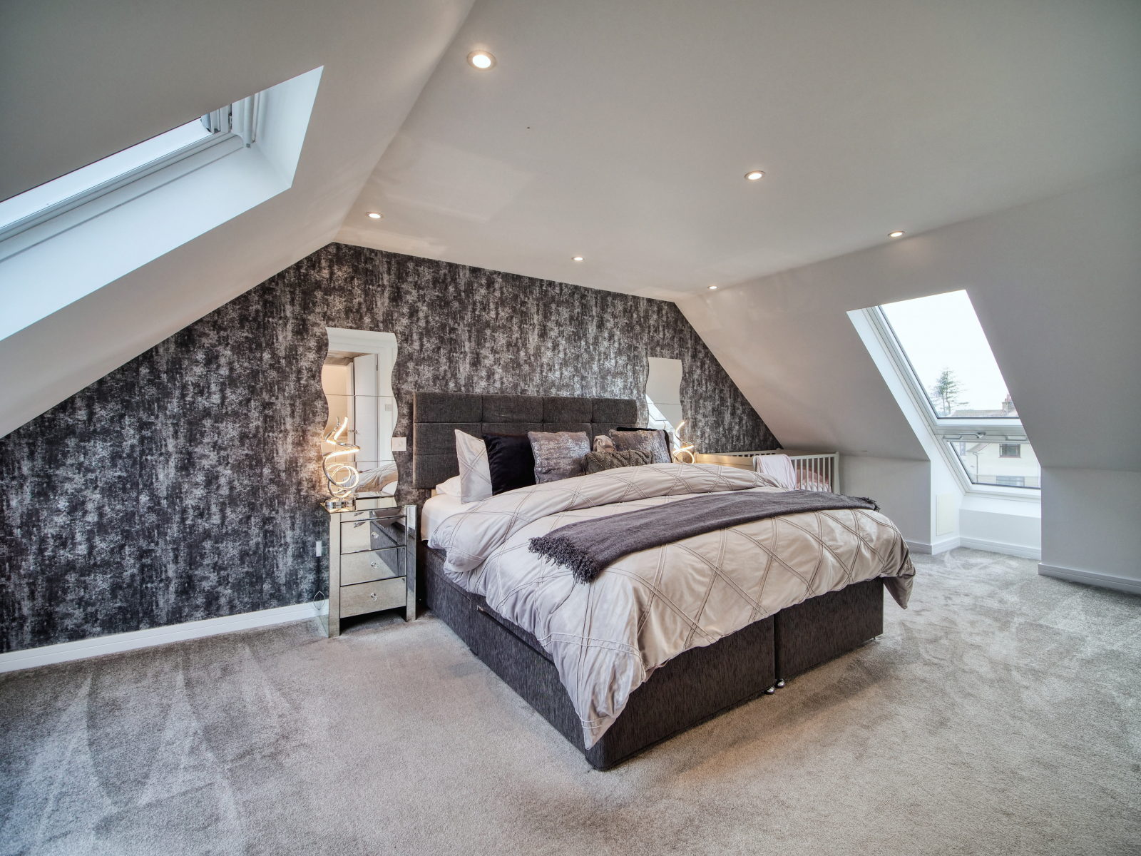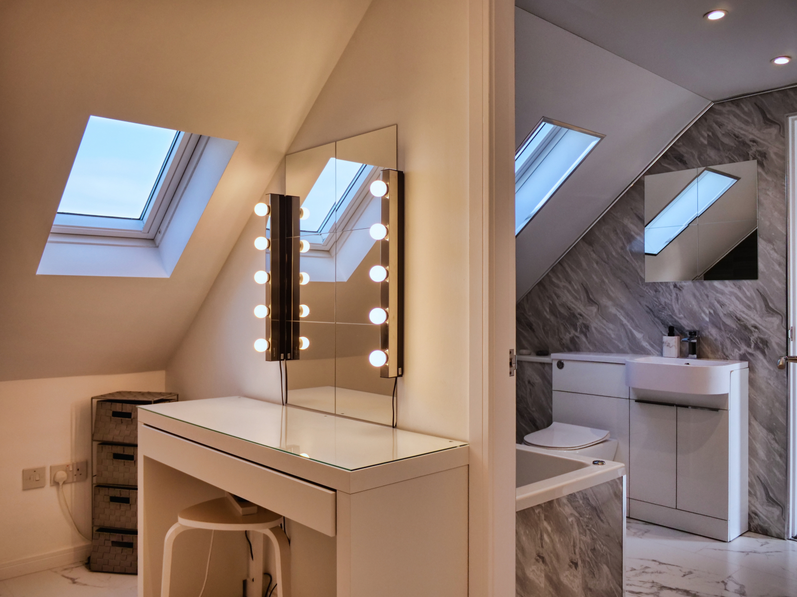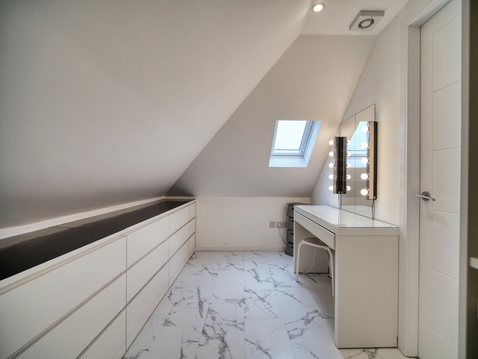 Ascending to the upper level, the attic conversion reveals a truly indulgent principal suite. Framed by Velux windows to both aspects, which open outwards to form twin roof balconies, this space feels bright, airy and wonderfully private. The adjoining en suite features a jet bath and a sleek vanity unit incorporating the wc and wash hand basin, creating a refined and relaxing retreat. Beyond this lies an impressive walk in dressing area, thoughtfully fitted with drawers and extensive wardrobe space, offering both elegance and organisation.