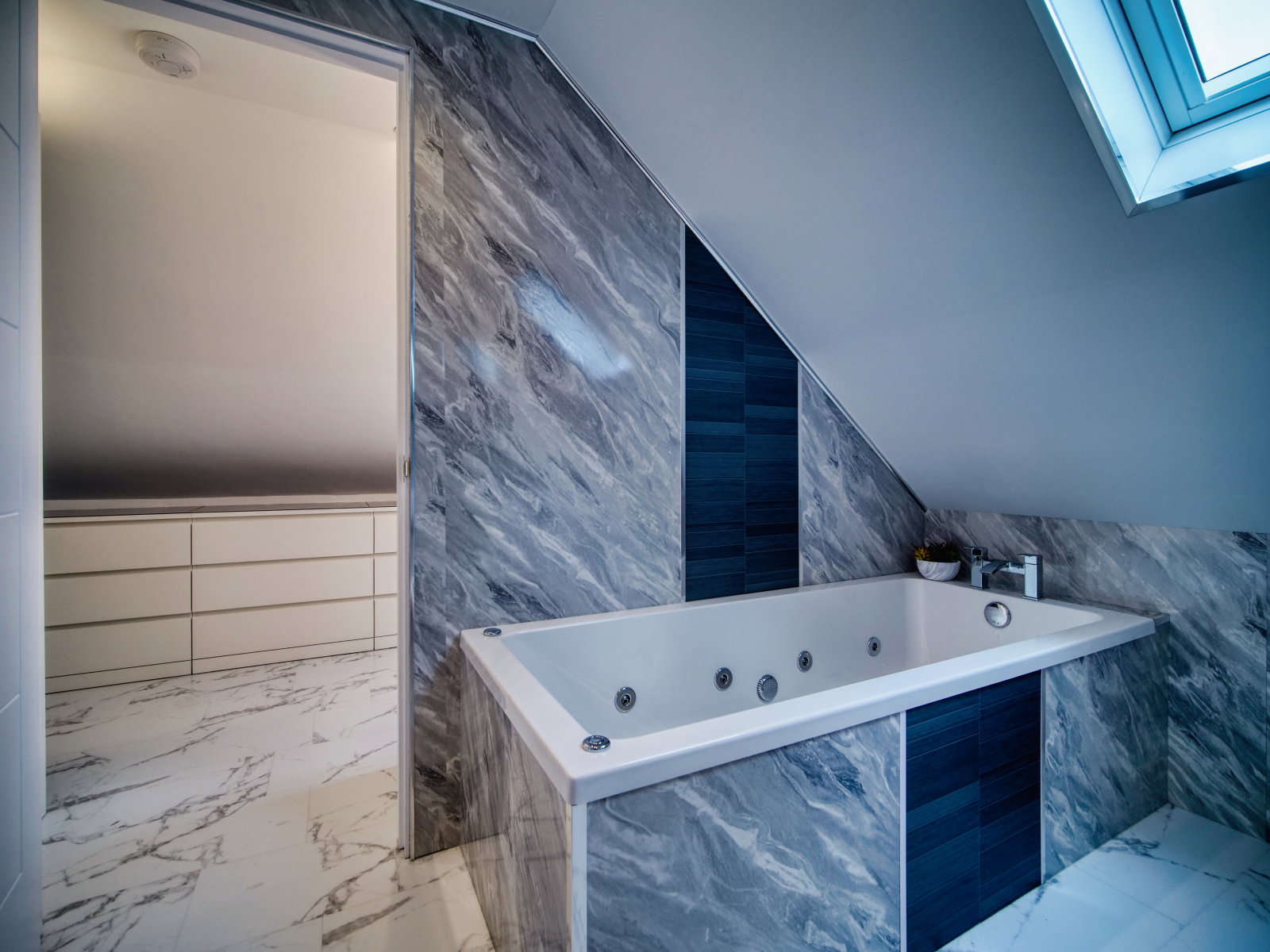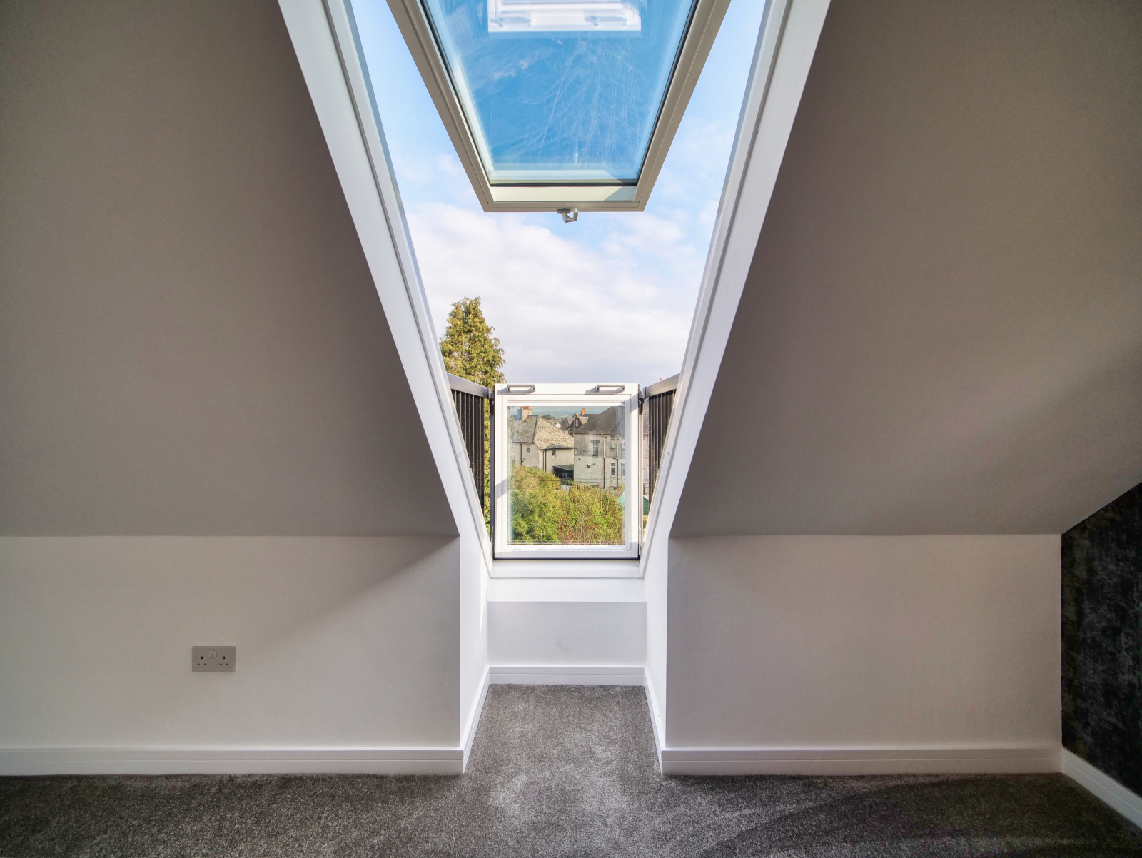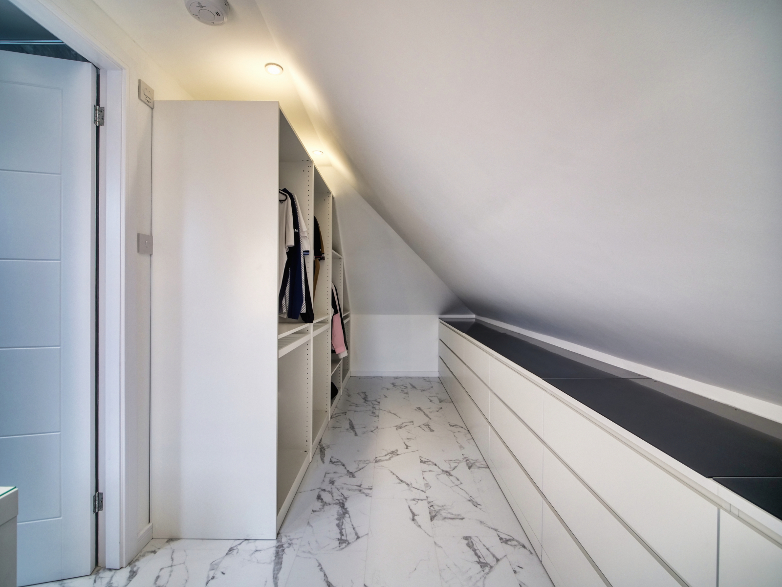 Ascending to the upper level, the attic conversion reveals a truly indulgent principal suite. Framed by Velux windows to both aspects, which open outwards to form twin roof balconies, this space feels bright, airy and wonderfully private. The adjoining en suite features a jet bath and a sleek vanity unit incorporating the wc and wash hand basin, creating a refined and relaxing retreat. Beyond this lies an impressive walk in dressing area, thoughtfully fitted with drawers and extensive wardrobe space, offering both elegance and organisation.