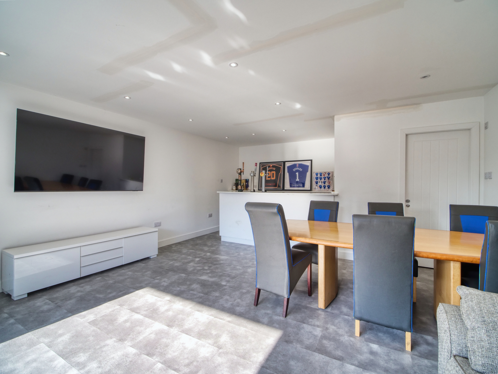 As if the interior were not impressive enough, the rear garden elevates this home to another level. Designed with both style and low maintenance living in mind, it boasts immaculate artificial lawn, expansive porcelain patio and composite decking that flows effortlessly through the space. The centrepiece is the remarkable garden room, a substantial and highly versatile addition currently styled as a sophisticated bar and social hub. Bathed in natural light and enhanced by bi folding doors, this exceptional space can be tailored to suit a variety of lifestyles, whether as a home office, gym, studio or entertainment suite.