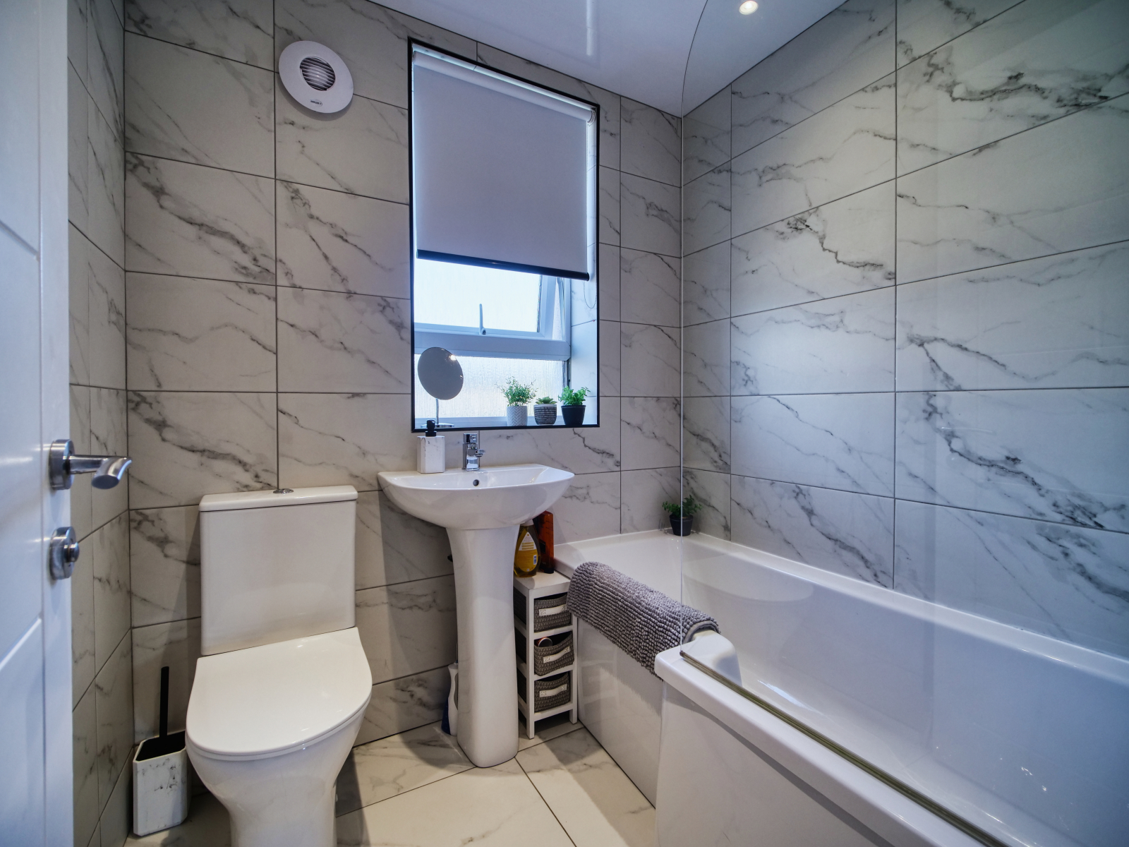 Two generously proportioned double bedrooms are situated on this level, each offering excellent storage and an abundance of natural light. The contemporary family bathroom is beautifully appointed, comprising wc, wash hand basin and a shower bath complete with overhead thermostatic rainfall shower, finished with modern fittings that enhance the sense of everyday luxury.