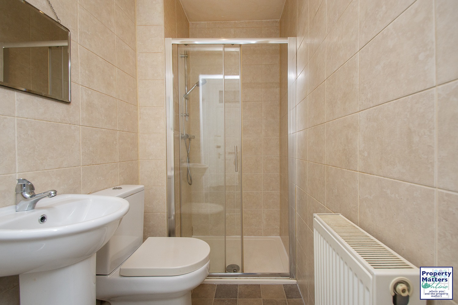 Modern shower room with 3 piece suite comprising\nwc and wash hand basin and large shower enclosure. Vinyl flooring.