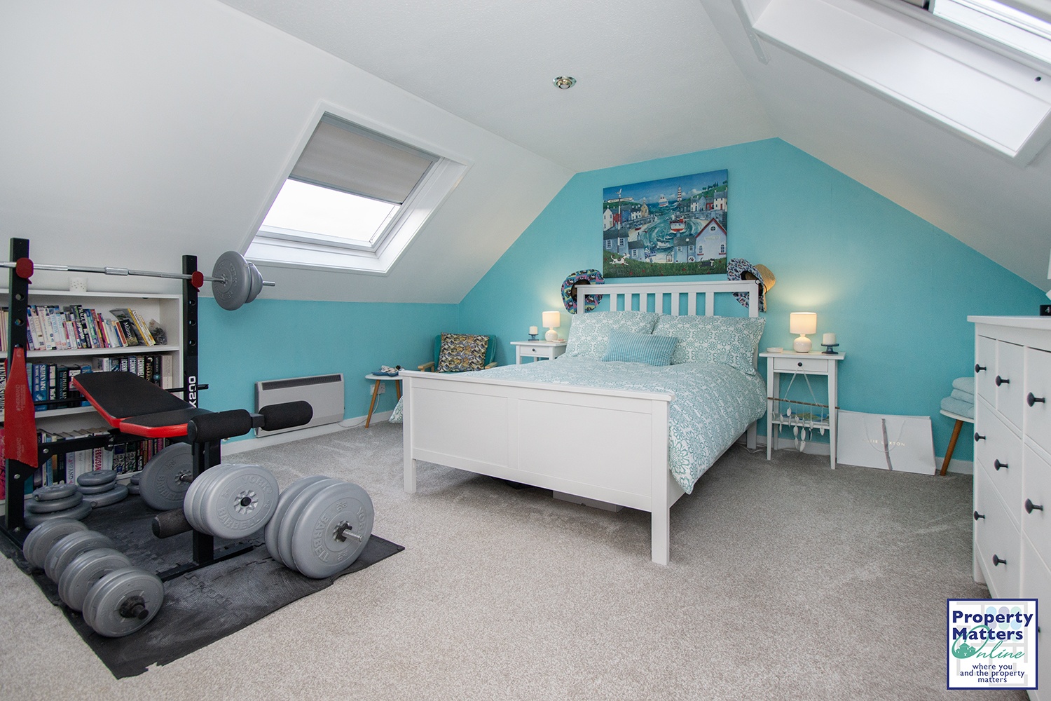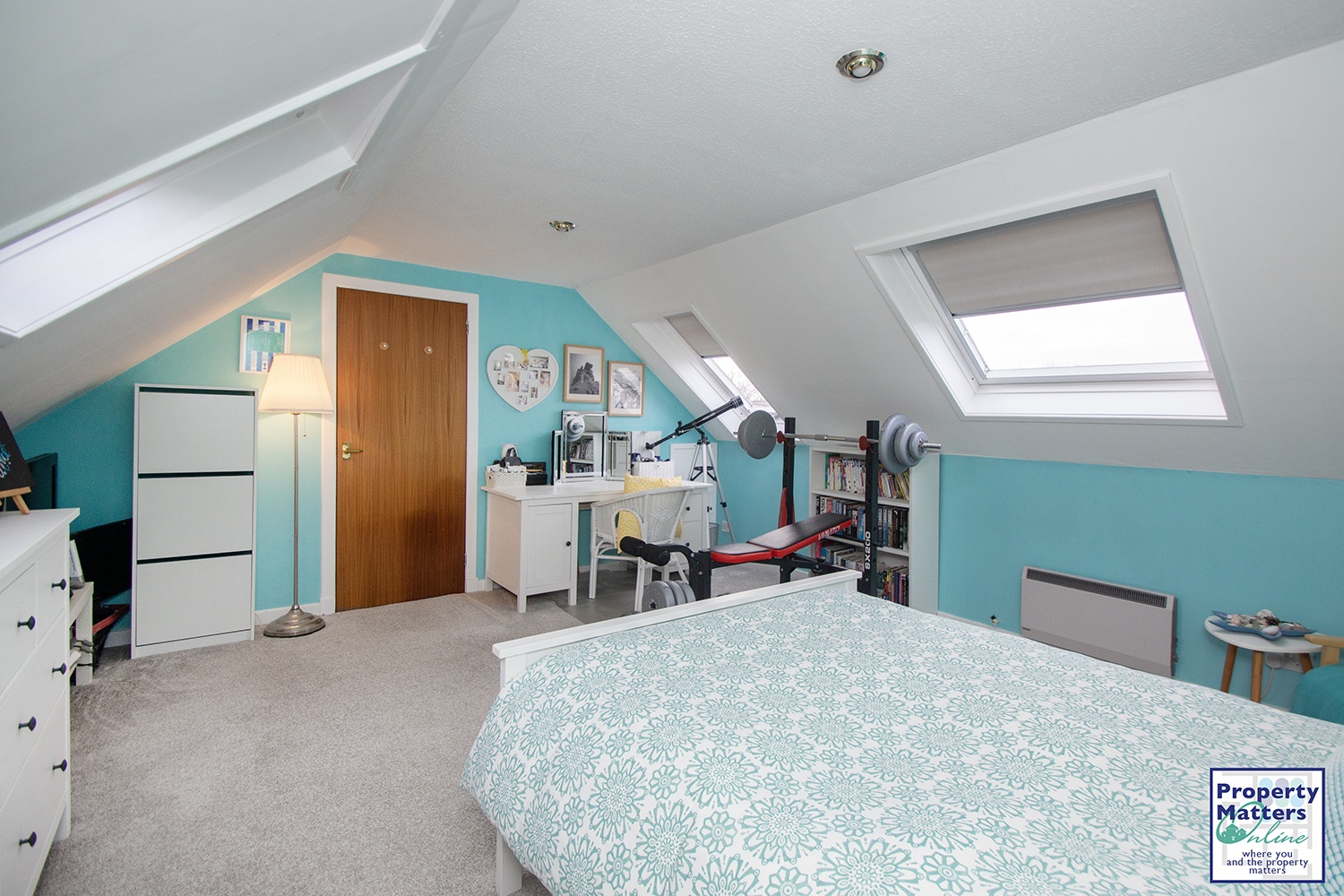 On the first floor, there are three generously sized bedrooms, two benefiting from integrated wardrobes, along with a three-piece family bathroom comprising WC, wash hand basin, and bath with overhead shower. The second floor hosts a substantial fourth bedroom, featuring twin aspect Velux windows that fill the space with natural light.